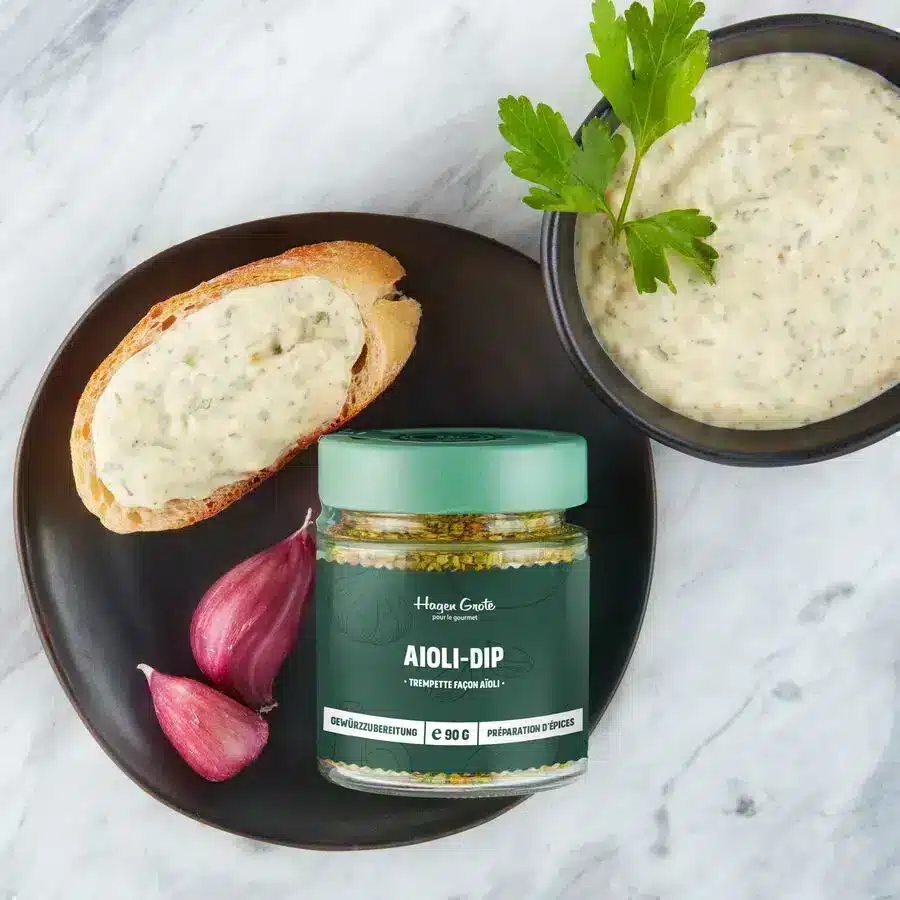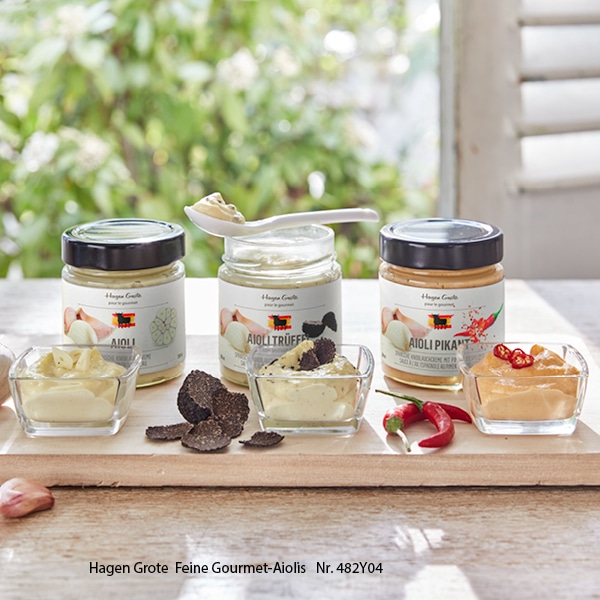 Für ein rauchiges Aroma sorgt geräucherte Aioli, während die pikante Aioli, verfeinert mit würzigem Piment d’Espelette, mit einer angenehmen Schärfe überzeugt. Eine edle Note verleiht unsere Trüffel-Aioli mit italienischem Sommertrüffel (Tuber aestivum Vitt.). Als perfekte Beilage zu Tapas bietet sich unser knuspriges Baguette con Aioli an.
