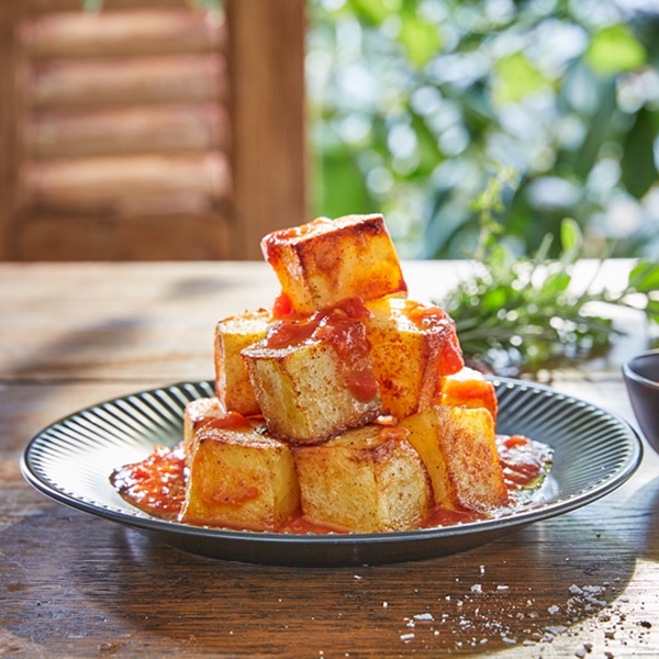 Ein echter Klassiker der spanischen Küche sind Patatas Bravas – knusprige, goldbraun frittierte Kartoffelstücke, die mit pikanter, würziger Salsa Brava, einer aromatischen, leicht scharfen Tomatensauce, serviert werden.