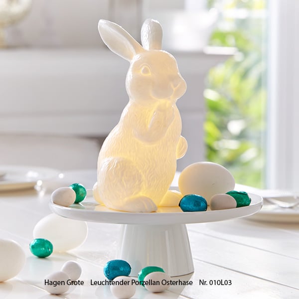 Eine wunderschöne Osterdekoration ist unser von Hand gefertigter, leuchtender Porzellan Osterhase, der in zwei Größen erhältlich ist. Detailgetreu gestaltet erstrahlt er mittels innovativer LED-Technik in angenehmem, warmweißem Licht. Dank drei langlebiger Knopfzellen geht das ganz ohne Kabel. Besonders schön sind machen sich kleiner und großer Hase in Kombination.