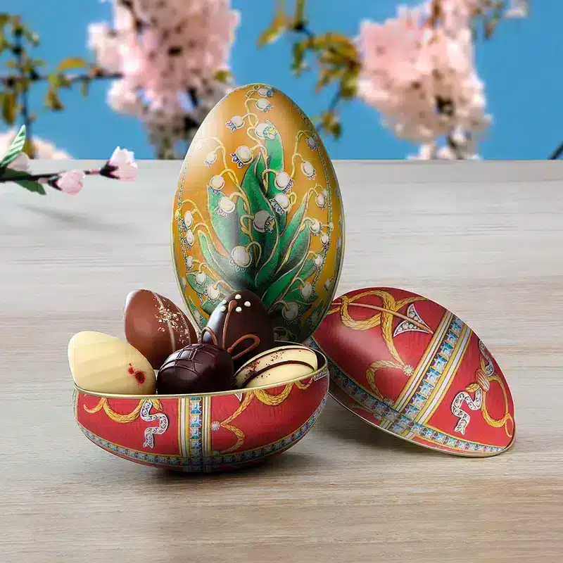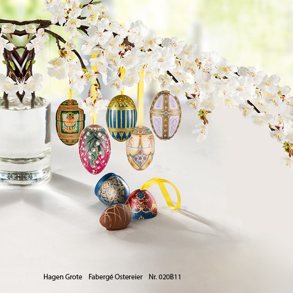 Ein attraktiver Osterschmuck sind unsere eleganten Fabergé Schmuck-Ostereier mit integriertem Aufhängeband. Die kleinen Kunstwerke sind aus langlebigem Metall gefertigt und den wundervollen und heute unbezahlbaren Originalen nachempfunden, die der berühmte Goldschmied Peter Carl Fabergé seit dem Jahr 1882 schuf. Gefüllt sind sie mit fein gefüllten Trüffelpralinen aus Zartbitter-, weißer und Vollmilch-Schokolade, die unsere Chocolatiers exklusiv für Sie von Hand fertigen.