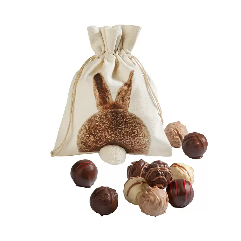 Mit einer hochfeinen Trüffelmischung haben unsere Chocolatiers diesen hübschen Hasenbeutel für Ostern gefüllt. Das perfekte Oster-Geschenk!