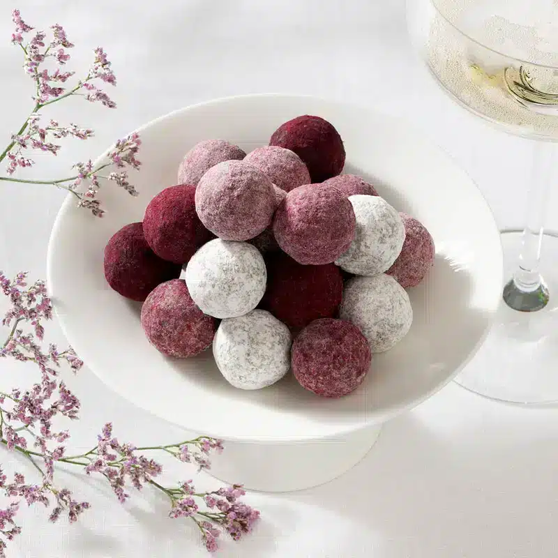 Unsere erlesene Marc de Champagne Trüffelmischung besteht aus 12 Pralinen in den 3 köstlichen Sorten Marc de Champagne, Pink Marc de Champagne und Kir Royal, veredelt mit Marc de Champagne und Cassis-Likör. Umhüllt von zartschmelzender Schokoladenganache und fein bestäubt mit Puderzucker und Johannisbeer-Pulver besonders hübsch auf dem Kaffeetisch oder als attraktives Geschenk.