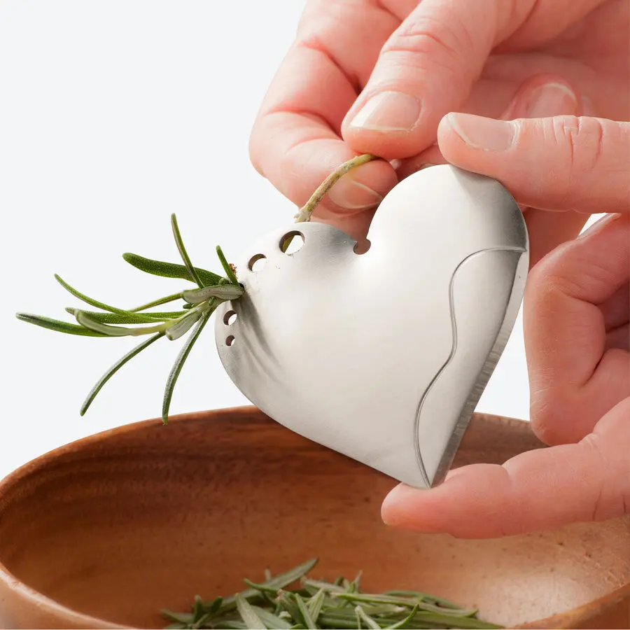 Kräuterzweiglein einfach durch das passende der 5 unterschiedlich großen Löcher ziehen. Größere Stängel oder buschige Petersilie und Basilikum lassen sich mithilfe der Fuge in der Herzmitte mühelos lösen.