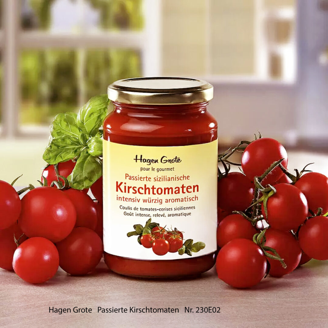Passierte sizilianische Kirschtomaten von Hagen Grote überzeugen durch ihren unnachahmlichen, vollen Tomatengeschmack. Nach unseren strengen Qualitätskriterien wachsen sie im Süden Siziliens heran. In mühevoller Handarbeit werden ausschließlich vollreife Früchte geerntet. Nach traditionellem Rezept wird die würzige Tomatenspezialität mit hochwertigem Olivenöl, frischem Basilikum, Sellerie und etwas Salz konserviert.