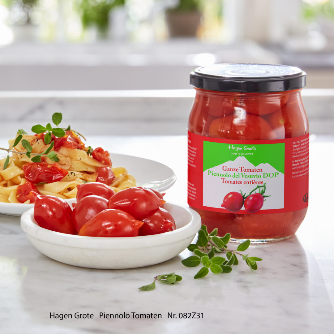 Unsere köstlichen Piennolo Tomaten DOP vom Fuße des Vesuvs lassen sich nur mühsam kultivieren. Nur noch wenige Bauern nehmen sich daher den kleinen, besonders würzigen Tomaten an. Sie ist wichtigster Bestandteil der klassischen, seit 500 Jahren bekannten neapolitanischen Spezialität „Pasta allo Scarpariello“ (nach Schuhmacher Art), einem ebenso simplen wie köstlichen Nudelgericht. Wunderbar harmonieren sie auch in anderen Pastagerichten sowie auf Pizza oder zu Fleisch.
