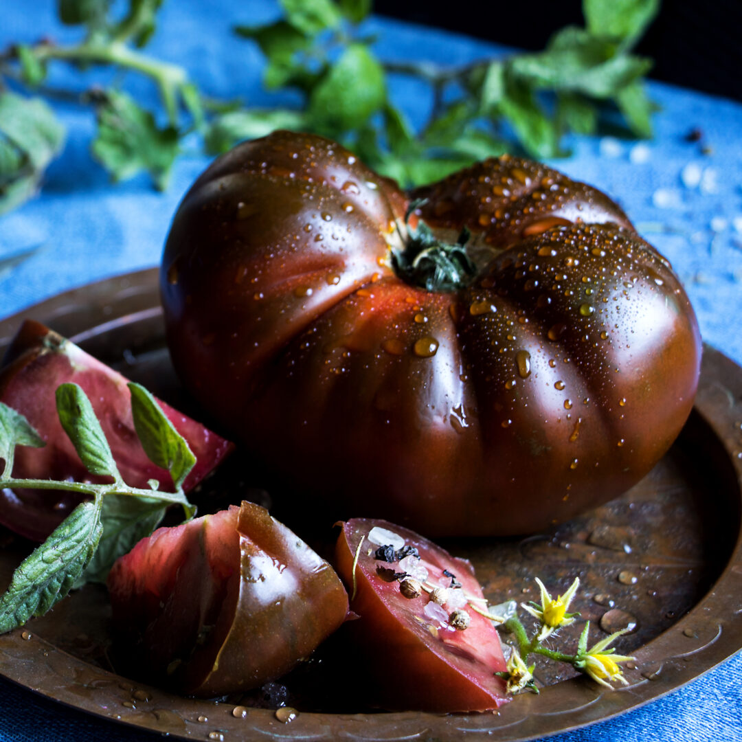 Schwarze Tomaten sind eine Rarität, die sich mit etwas Glück beim gut ausgestatteten Gemüsehändler finden lässt. Nimmt man es genau, ist die Schale der Früchte jedoch gar nicht schwarz gefärbt, sondern eher dunkelbraun bis violett. Schwarze Tomaten zählen ebenfalls zu den Fleischtomaten und sind in Osteuropa beheimatet. Die bekanntesten Sorten tragen die klangvollen Namen „Schwarzer Prinz“ und „Black Krim“. Saftig, süß und hocharomatisch gilt die schwarze Tomate als besondere Spezialität. Aufgrund ihrer dekorativen Färbung eignen sie sich besonders gut für ein Tomaten-Carpaccio mit hochwertigem Olivenöl und grobem Meersalz.