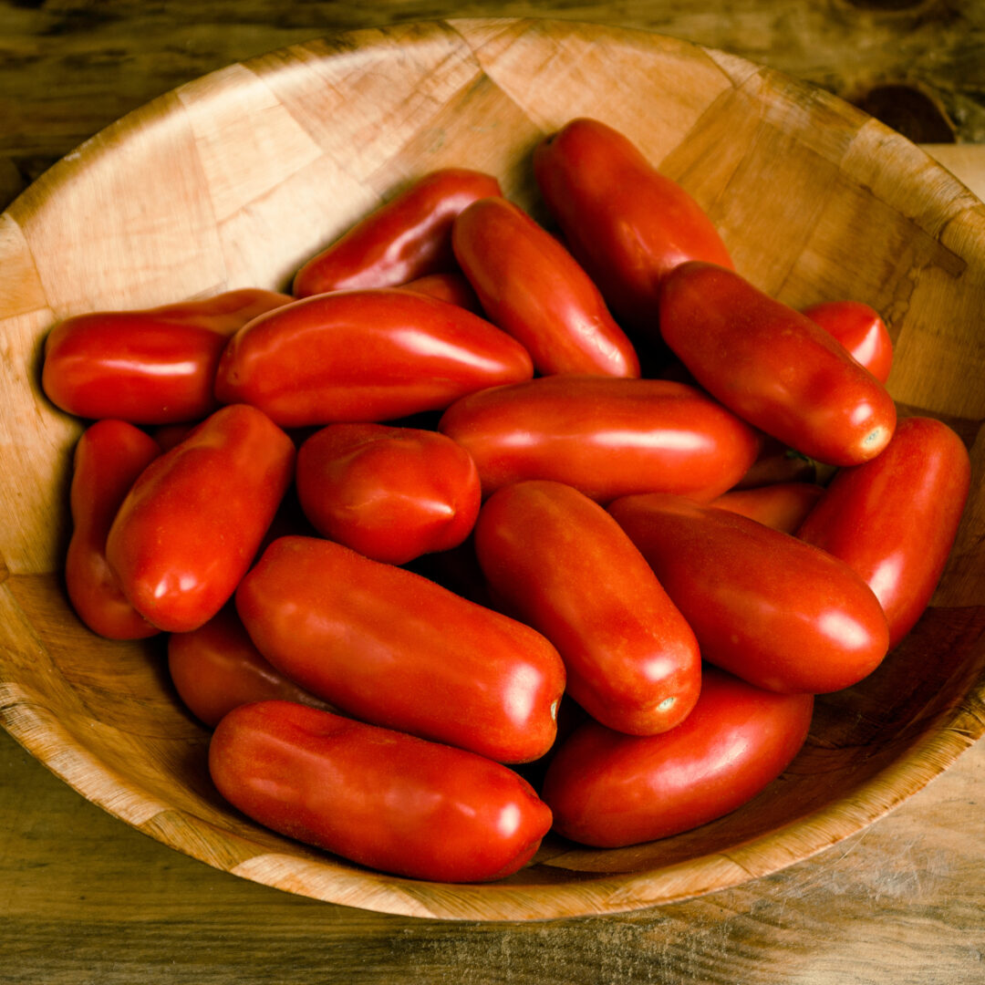 San Marzano Tomaten gelten als Italiens aromatischste Speisetomaten. Sie gedeihen ausschließlich nahe Neapel in fruchtbarer Vulkanerde des Vesuvs.