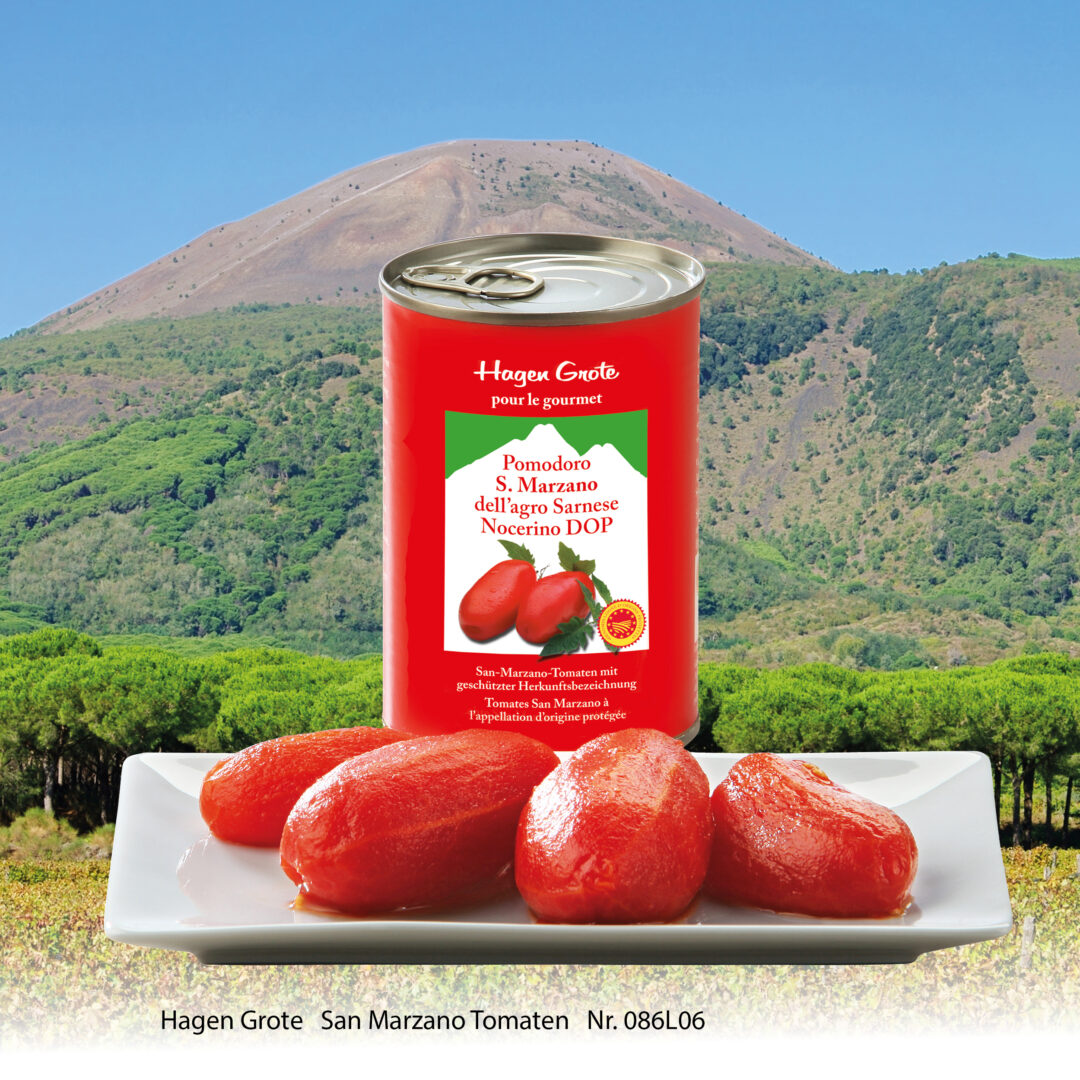 Benannt nach dem gleichnamigen, kleinen Örtchen ist sie die einzige Tomate mit geschützter Herkunftsbezeichnung. Die längliche Flaschentomate mit wenig Kernen und geringem Flüssigkeitsanteil zählt ebenfalls zu den Fleischtomaten und überzeugt durch ein selten gewordenes, intensives Tomatenaroma, wie man es bei anderen Sorten kaum findet. Ihr hocharomatischer Geschmack geht auch auf die optimalen Wachstumsbedingungen zurück, die sie in ihrer Heimat am Fuße des Vesuvs erfährt. Fruchtbare, reichhaltige Vulkanböden und das ausgeglichene Küstenklima sind für die empfindlichen Pflanzen ideal. Aufgrund ihrer hohen Sensibilität sind San Marzano Tomaten für die industrielle Massenproduktion nicht geeignet und waren deshalb bereits vom Aussterben bedroht. Inzwischen gibt es wieder einige wenige Kulturen, da mit Hilfe der örtlichen Regierung und Slow Food Italien das Saatgut gesichert werden konnte. Durch garantierte Abnahmemengen unterstützt Hagen Grote die verbliebenen Produzenten. San Marzano Tomaten werden üblicherweise konserviert und zum Kochen verwendet. Dank ihres einmaligen, intensiven Tomatengeschmacks veredeln sie eine Vielzahl unterschiedlicher Gerichte.