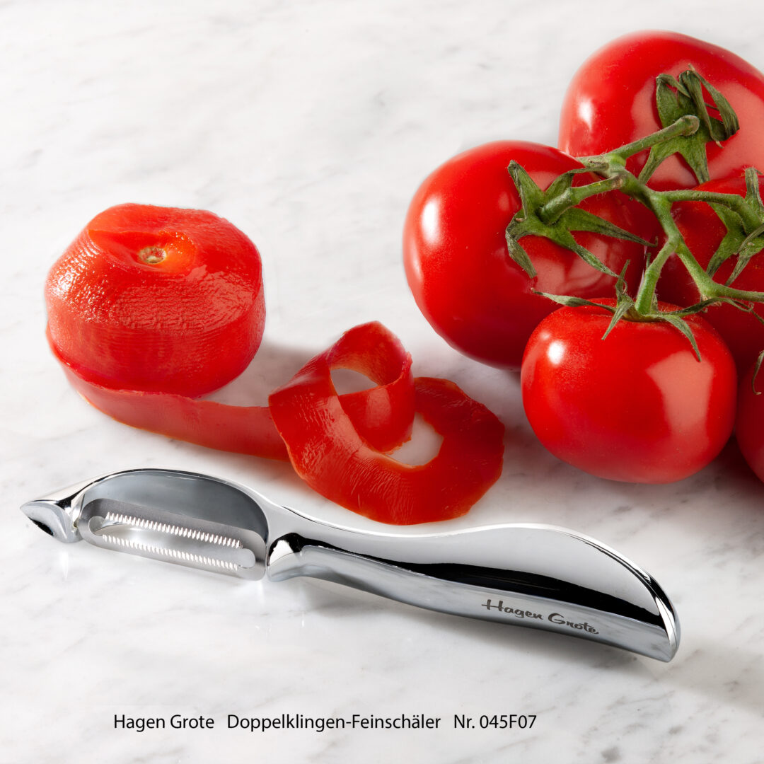 Optimal zum Entfernen der dünnen, unverdaulichen Haut des Gemüses eignet sich unser Tomaten- und Paprikaschäler. Schnell und einfach trennt der Schweizer Feinschäler mit seinen feinen, leicht gezahnten Klingen Schale und Fruchtfleisch. Unschöne Stellen entfernen Sie mit seiner praktischen Ausstecher-Spitze. Für Rechts- und Linkshänder ist der spülmaschinenfeste Schäler gleichermaßen geeignet.