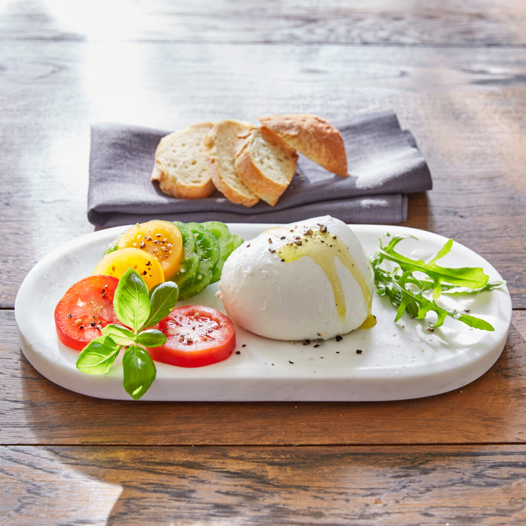 Einzigartig im Geschmack und von einer wunderbaren Cremigkeit ist der Mozzarella di Bufala Campana D. O. P.. Die feine Delikatesse wird aus der Milch freilebender italienischer Wasserbüffel-Weibchen in einer familiären Molkerei in Kampanien gefertigt. Artgerecht leben die Tiere das ganze Jahr über auf saftigen, grünen Wiesen und ernähren sich von frischem Gras, Blumen und Kräutern, ohne Zugabe von Antibiotika oder Hormonen.