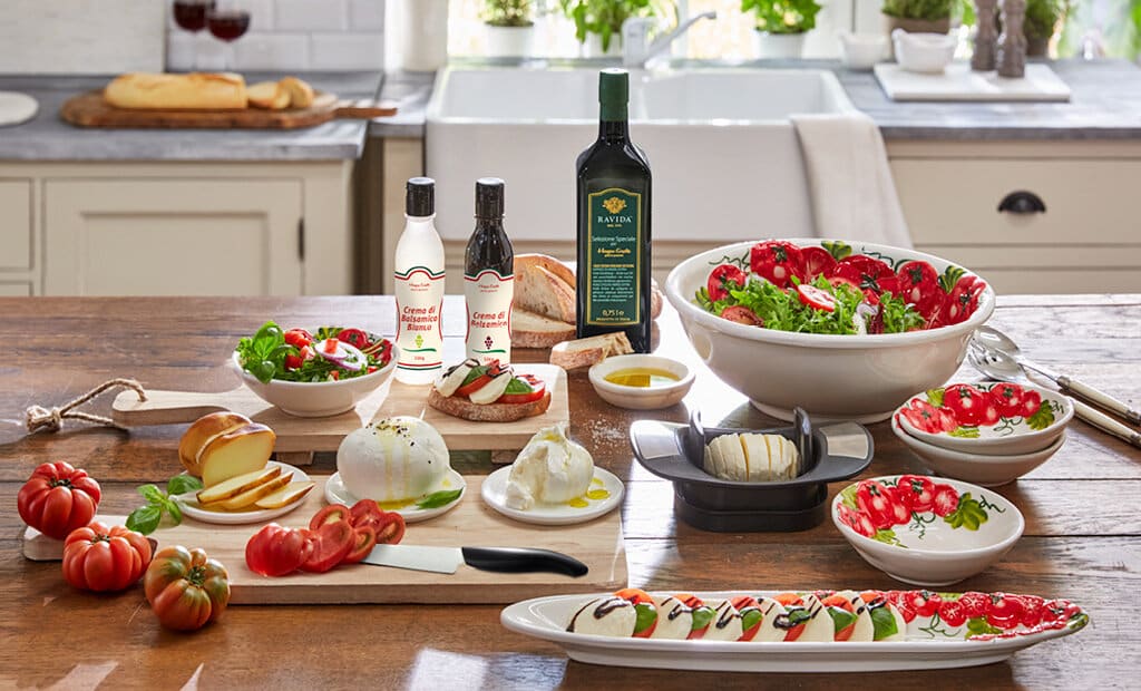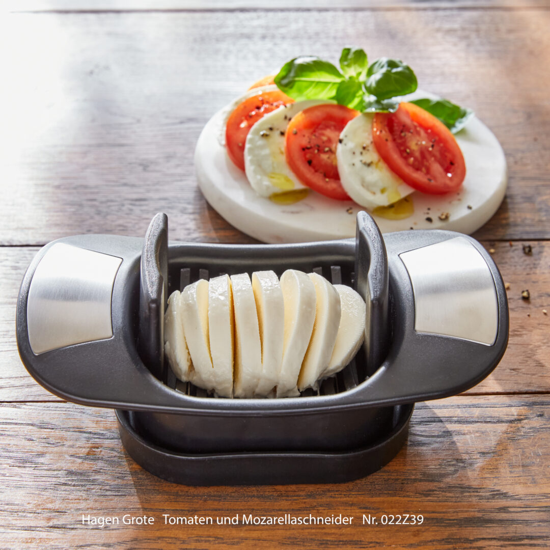 Besonders schnell und bequem gelingt Ihnen Caprese mit unserem 2-in-1-Tomaten- und Mozzarella-Schneider. Seine gezahnten Klingen sind so angeordnet, dass sich der Druck beim Schneiden optimal verteilt. So werden die empfindlichen Zutaten nicht zerdrückt, sondern in einem Arbeitsgang in 9 absolut gleichmäßige, 8 mm dicke Scheiben geschnitten. Dank Führungsschiene verrutscht nichts, überschüssige Flüssigkeit wird in die Auffangschale abgeleitet.