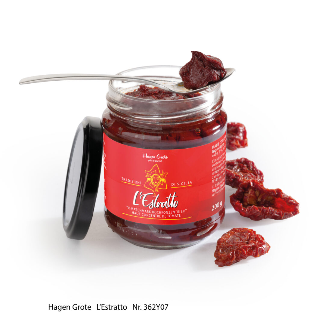 Auch mit unserem L’Estratto lassen sich feine Fleisch- oder Fischgerichte wunderbar verfeinern. Das hocharomatische Tomatenkonzentrat (1 kg wird aus 20 kg sonnengetrockneten Siccagno-Tomaten gewonnen) bringt eine herrliche Umami-Würze an Ihre Speisen.
