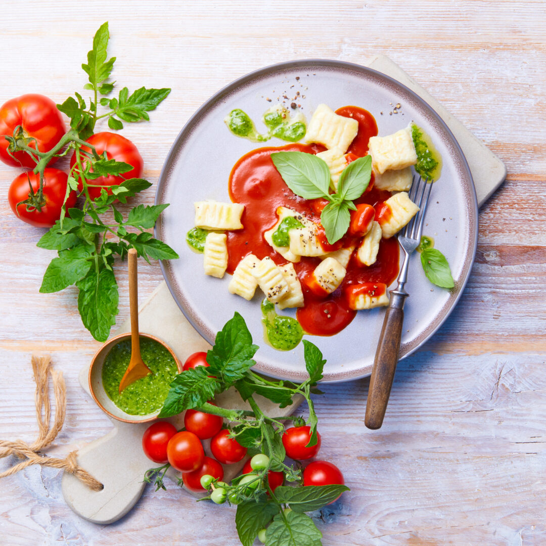 Ob Getrocknete Kirschtomaten mit Bavette, Entenravioli mit Tomaten-Concassée und Pfifferlingen, Ricotta-Gnocchetti, Tomatensugo und Basilikum-Pesto oder klassische Spaghetti Napoli, ob frisch oder getrocknet, pur oder in Form einer Sauce: Untrennbar gehören Tomaten und Pasta kulinarisch zusammen.