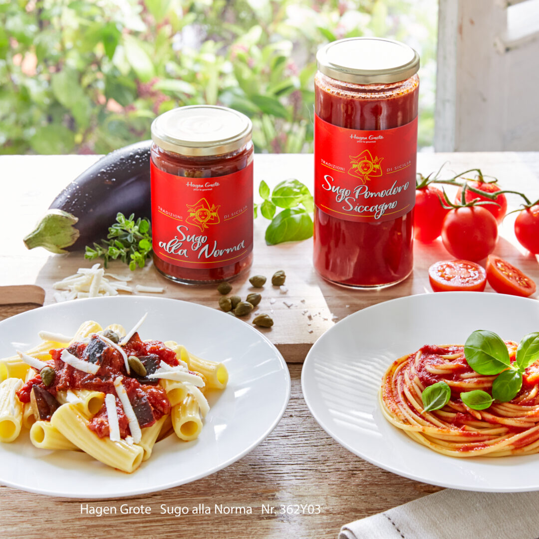 Überaus köstliche, traditionelle Saucen-Spezialitäten sind Sugo alla Norma und Sugo Pomodoro Siccagno. Die feinen Gemüse, die für diese hochwertigen Saucen verwendet werden, wachsen in den sizilianischen Madonie-Bergen heran. Die Höhe von 800 m sowie die kaliumreichen Lehm-Kalk-Böden sorgen für unvergleichlich-intensive Aromen. Sugo alla Norma mit erntefrischen Auberginen wird mit kurzen Nudeln, vorzugsweise Maccheroni, festem, gesalzenem Ricotta-Salata-Schafskäse, hauchdünnen, frittierten Auberginenscheiben und Basilikum zum typisch-sizilianischen Gericht Pasta alla Norma. Sugo Pomodoro Siccagno aus den nur auf Sizilien vorkommenden, hocharomatischen Siccagno-Tomaten ist die perfekte Basis für Pizza, harmoniert mit Pasta-Gerichten sowie Fisch und Fleisch.