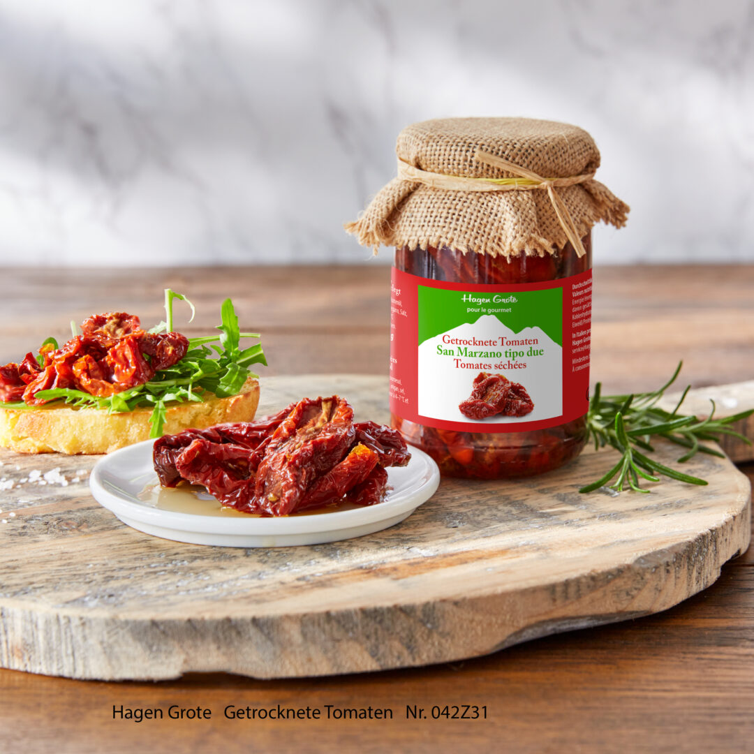 Auch trockene Tomaten, wie die hocharomatischen San Marzano tipo due, die zum Ende des Sommers vollreif geerntet werden, veredeln Pizza und Pinsa auf köstlichste Weise. Schonend sonnengetrocknet, fein abgeschmeckt mit Oregano, Chili und Kapern und exklusiv für Hagen Grote in kalt gepresstem Pflanzenöl konserviert kommen ihre intensiven Aromen noch besser zur Geltung.