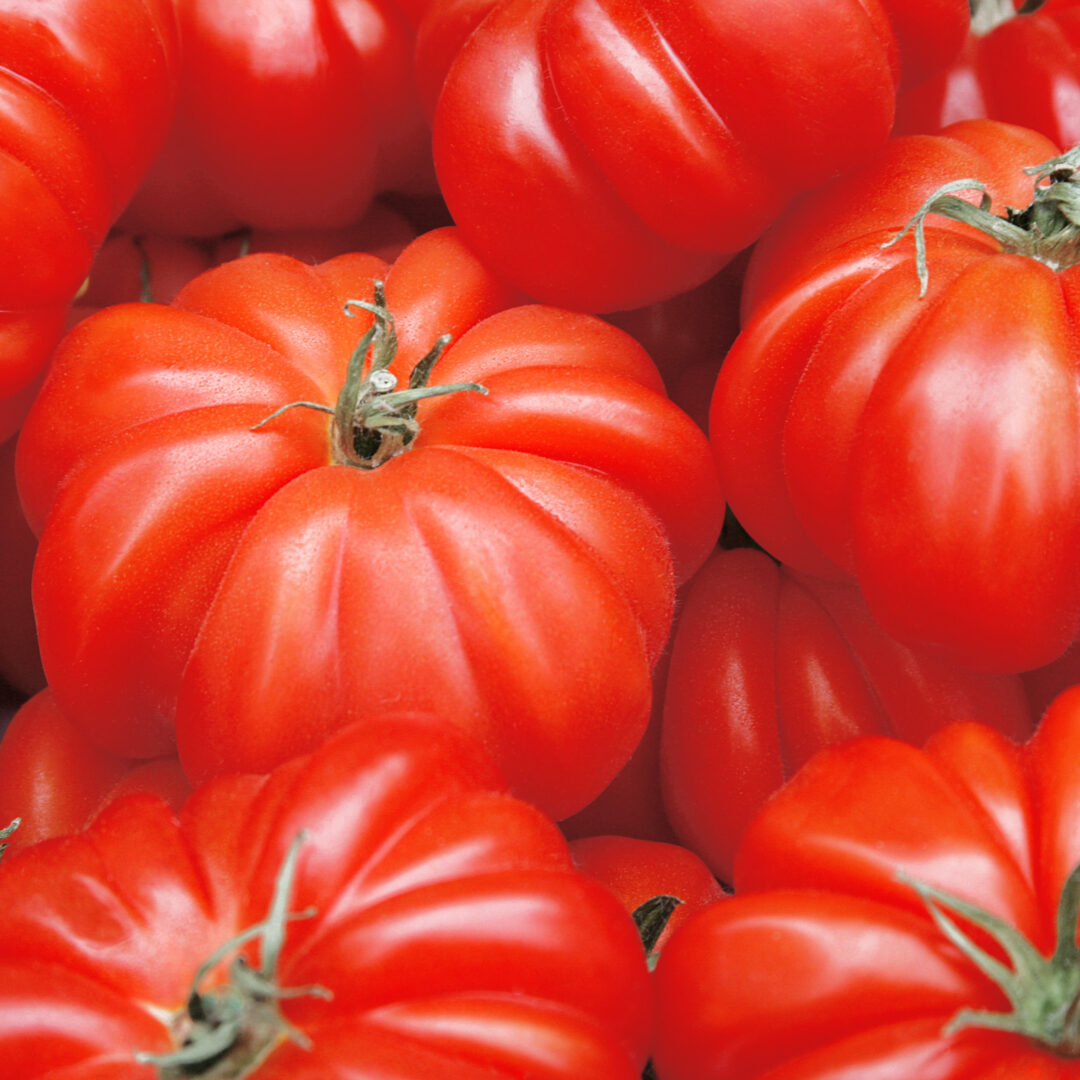 Mit einem „Kampfgewicht“ von durchschnittlich 100-200 g pro Stück gehört die Fleischtomate zu den größten Sorten. Teilweise können einzelne Früchte sogar ein Gewicht von bis zu 1 kg erreichen. Besonders wohl fühlt sich der Riese in warmen Regionen, wo er besonders gut wächst. Fleischtomaten sind rund oder gerippt geformt und verfügen meist über mehrere Kammern mit wenig Samen und Flüssigkeit. Durch ihr besonders festes Fruchtfleisch sind sie schnittfest und fallen beim Kochen nicht zusammen. Daher werden sie beispielsweise mit Vorliebe zum Füllen genutzt. Besonders beliebte Fleischtomaten sind das ungarische „Ochsenherz“ sowie die französische „Marmande“.