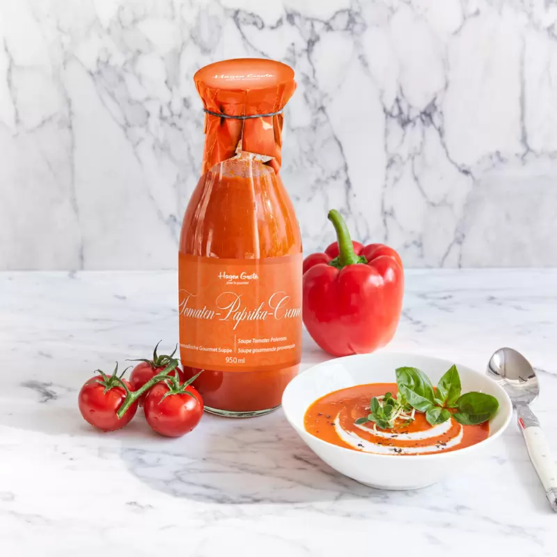 In der Hagen Grote Delikatessen-Manufaktur fertigen wir diese elegante Suppe mit bestem heimischem Gemüse. Erntefrische, hocharomatische Tomaten und rote Paprika werden einige Stunden einreduziert. Fein püriert wird die Suppe anschließend mit Piment d’Espelette und nativem Olivenöl abgeschmeckt. Genießen Sie den hocharomatischen, intensiv-fruchtigen Tomaten-Paprika-Geschmack mit der angenehmen Schärfe des Piment d’Espelette. Diese einzigartige Fertigsuppe unserer Spitzenköche lässt sich bestenfalls optisch beim Anrichten mit dekorativen Zutaten ein wenig steigern.