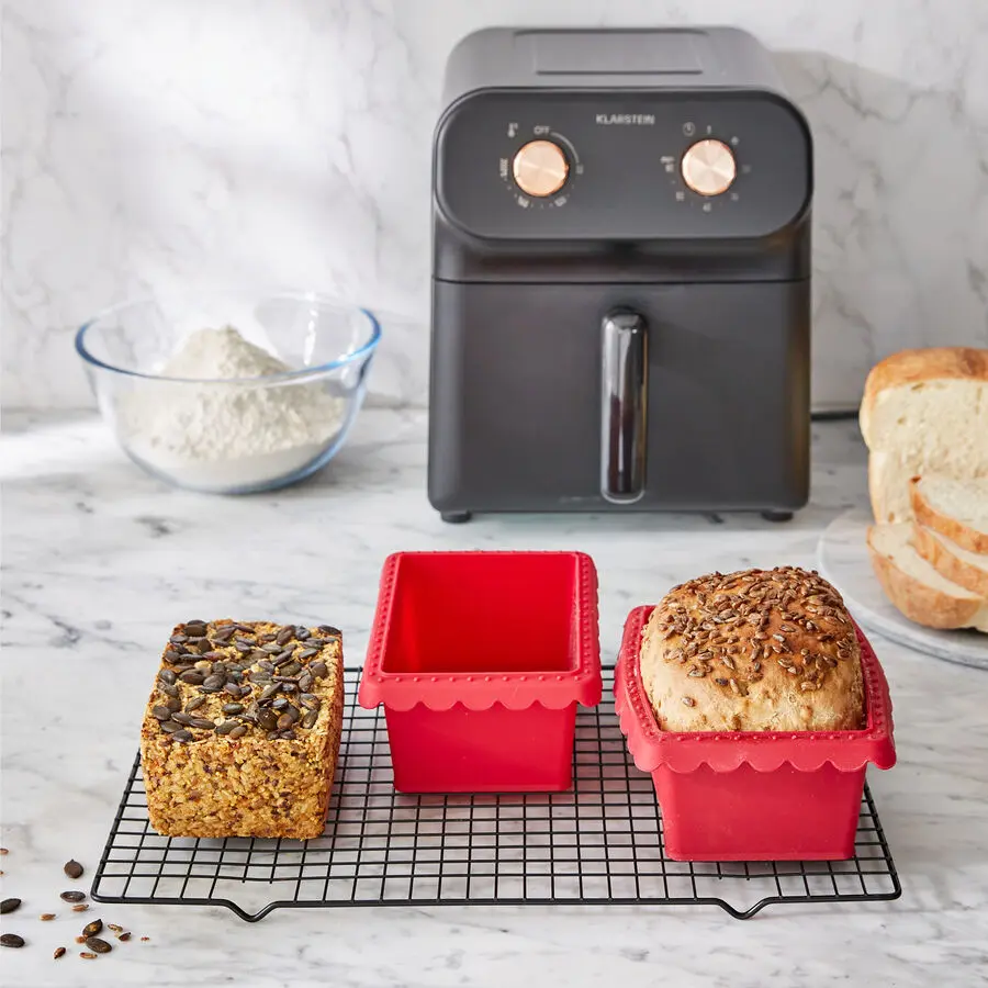 Perfekt gelingen darin feine Kuchen oder knusprige Brote (500 g). Dank ihrer kompakten Größe eignet sie sich auch für den energiesparenden Einsatz in Heißluftfritteuse (Airfryer) oder Mikrowelle.