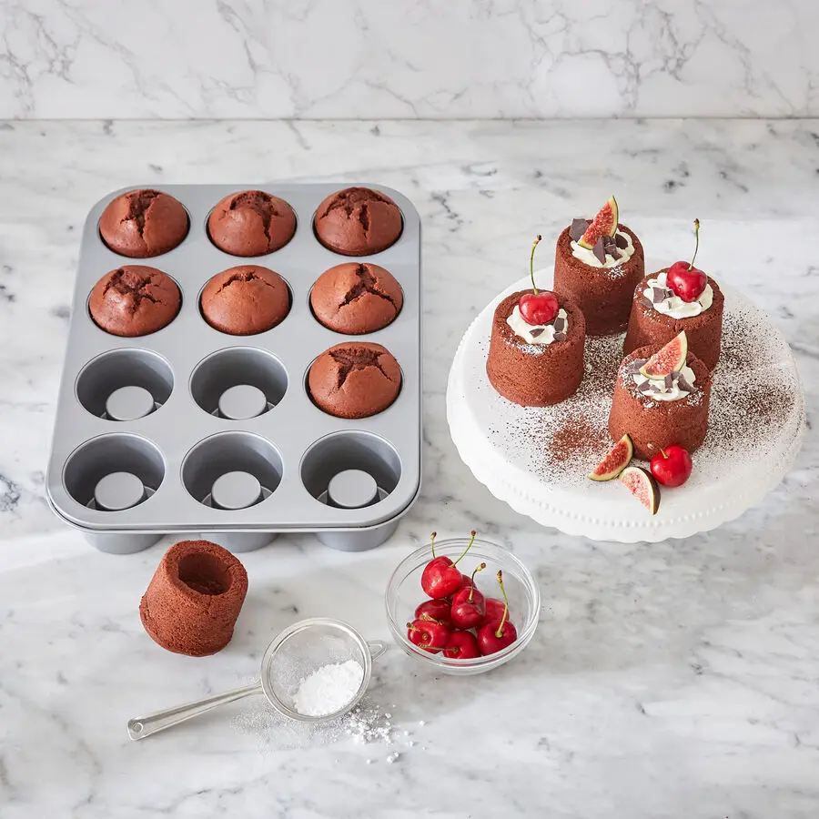 Durch das spezielle Design der Form entstehen darin bei geringstem Aufwand 12 kleine Becherformen zum Füllen. Verwenden Sie unterschiedlichen Teig, je nach süßem oder herzhaftem Inhalt.