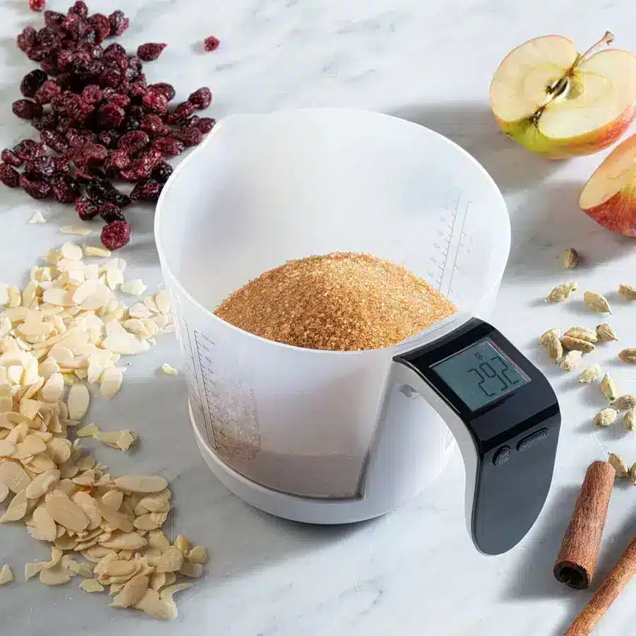 Mit der digitalen Messbecherwaage wiegen Sie nicht nur in exakten 1 g-Schritten bis zu 3 kg und messen bis zu 1 Liter in 50 ml-Schritten. Sie ermitteln auch das spezifische Gewicht von Milch, Wasser, Öl (g, lb/oz, ml, fl.oz).