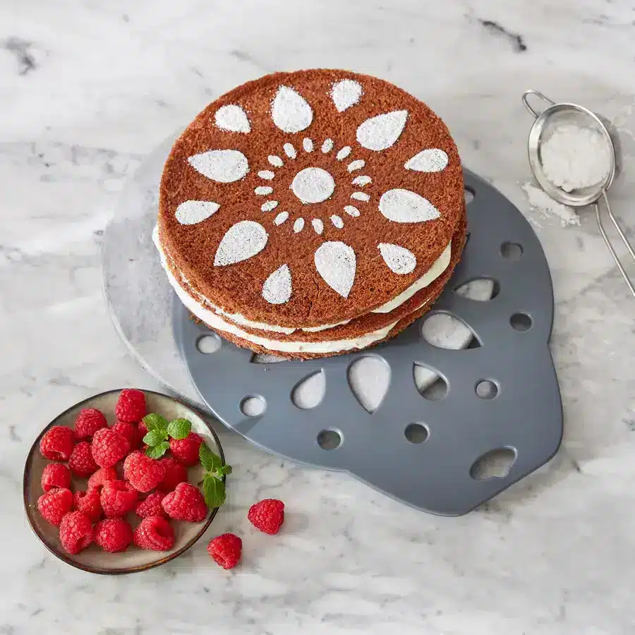 Mit Puderzucker oder Kakao zaubern Sie mit dieser Kuchenschablone attraktive Muster auf Kuchen und Torten. Gleichzeitig helfen die Deko-Elemente beim Zerteilen des Backwerks in wahlweise 12 oder 16 gleichmäßig große Stücke.
