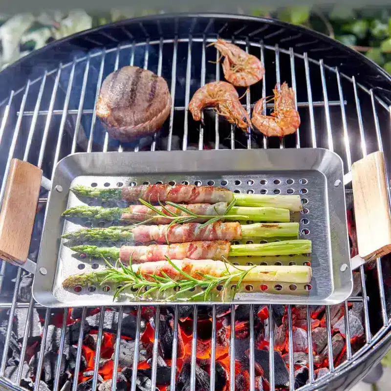 Für bunte Spieße oder Stangengemüse wie Spargel ist ein längeres Grilltablett optimal. So hat das Grillgut ausreichend Platz, nichts kann durch das Rost fallen und alles gart gleichmäßig durch.