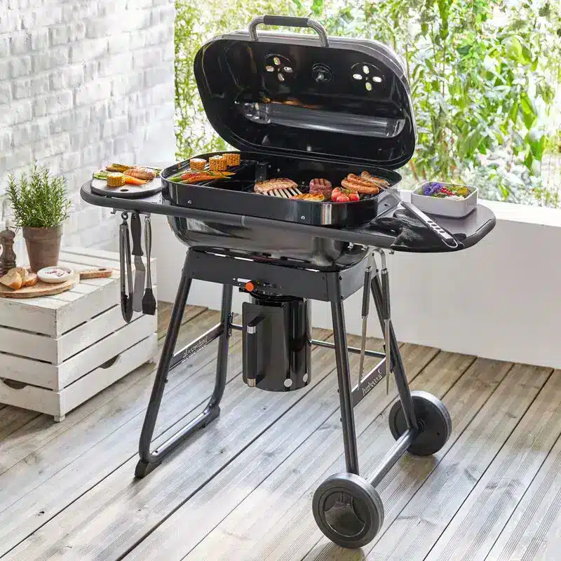 Reichlich Platz für viele Grillportionen bietet die dreigeteilte, höhenverstellbare 67 x 42 cm große Gusseisen-Grillrostfläche. Ideale 90 cm Arbeitshöhe, große seitliche Ablageflächen mit Aufhänge-Haken, integrierter Holzkohle-Starter.