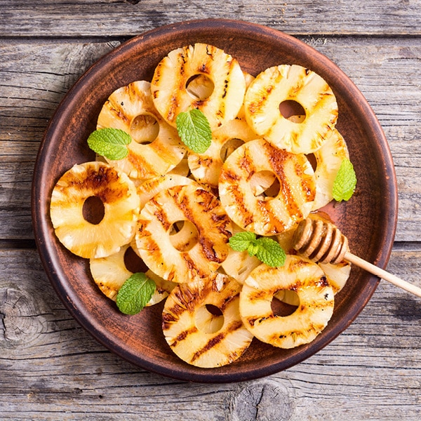 Ideal als fruchtige Beilage oder leichtes Dessert ist gegrillte Ananas. In der herzhaften Variante verleiht die Südfrucht schmackhaften Spießchen mit Gemüse und asiatisch mariniertem Tofu eine exotische Note. Vor dem Grillen mit etwas braunem Zucker und gehackter Minze bestreut ist sie ein köstliches Dessert zu veganem Vanilleeis.