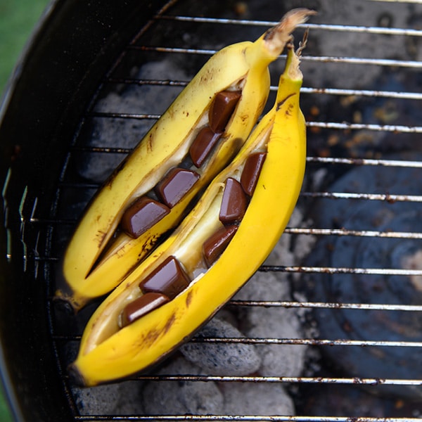 Auch Bananen eignen sich wunderbar als köstliches Grilldessert. Dazu in der Schale für etwa 12-14 Minuten bei geschlossenem Grilldeckel indirekt garen. Wer mag, schneidet die Schale vorab vorsichtig auf und gibt einige Stücke Zartbitterschokolade (in der Regel vegan) darunter. Die fertigen (Schoko-)Bananen anschließend mit veganem Vanilleeis, veganer Sahne und Haselnusskrokant oder gehackten und gerösteten Walnüssen servieren.