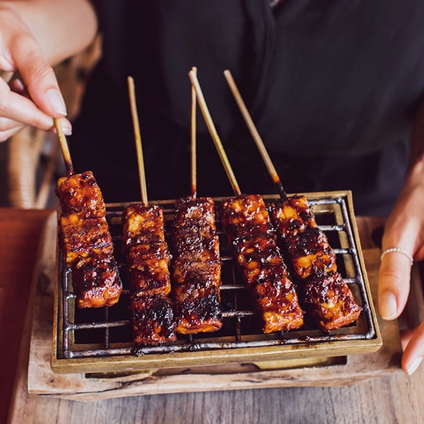 Ebenfalls aus der Küche Asiens stammt Tempeh, der aus fermentierten Sojabohnen gewonnen wird. Im Gegensatz zu Tofu verfügt er über eine festere Konsistenz sowie einen ausgeprägteren, nussig bis würzigen Eigengeschmack. Zu finden ist er meist in Bioläden oder im asiatischen Supermarkt. Tempeh kann pur gegrillt oder wie Tofu zunächst mariniert werden. Besonders gut schmeckt er in dünne Scheiben geschnitten oder in Würfeln auf Spießchen gesteckt. Dazu passt Saté-Sauce. Grillzeit: Etwa 10 Minuten.