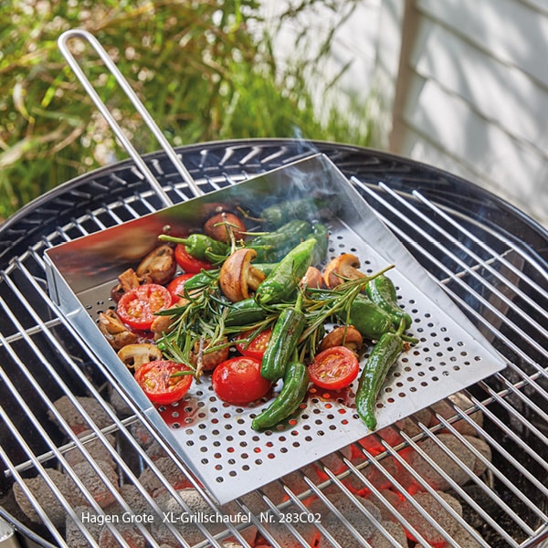 Unsere Grillpfanne oder die praktische XL-Grillschaufel sind die besten Optionen, wenn es um größere Grillgut-Mengen geht. Sowohl in der Pfanne als auch auf der Schaufel lässt sich empfindliches Grillgut komfortabel garen, schwenken und transportieren, ohne, dass etwas danebenfällt.