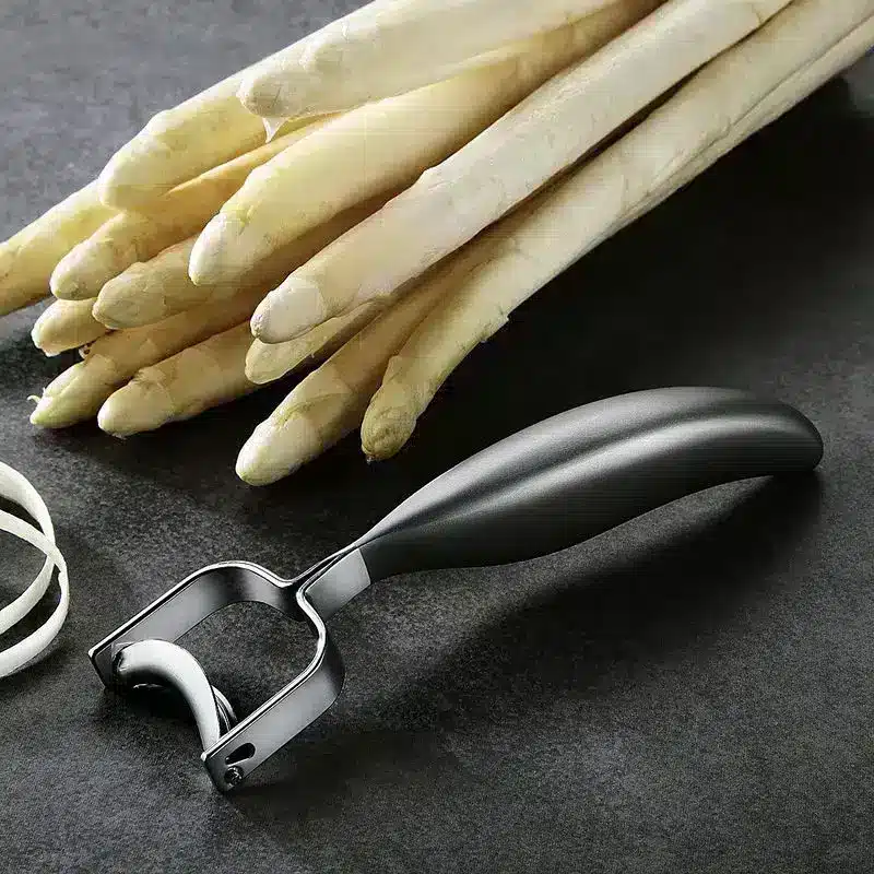 Rundklingen-Spargelschäler: Sparsamer, schneller, feiner Spargel und Gemüse schälen. Die extra scharfe, handgeschliffene Rundklinge ist der Spargelform perfekt angepasst.