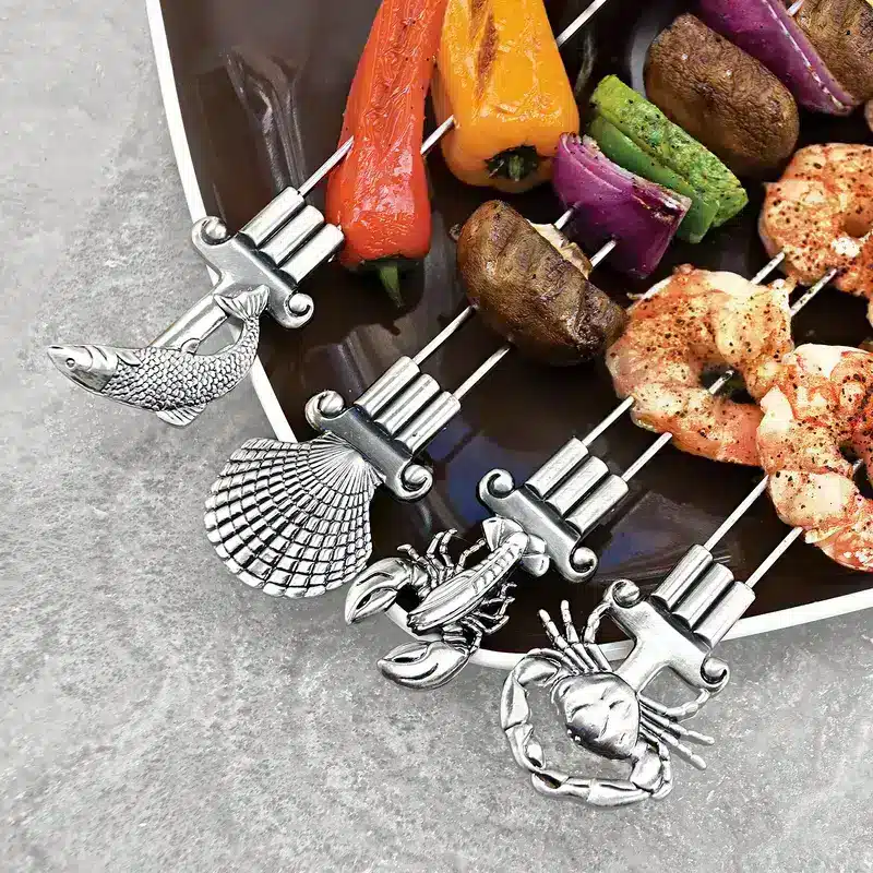 Meeresfrüchte, Fisch oder Fleischstücke sowie Gemüse finden auf den großen Doppelspießen festen Halt. Das ist besonders wichtig für empfindliches Grillgut.