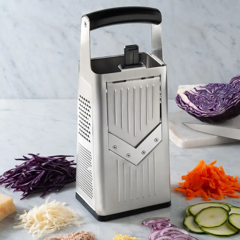 Messerscharfe Laser-Cut-Reibzähne verarbeiten sicher und kraftsparend auf der Grobreibe Obst, Gemüse, harte Süßkartoffeln. 2-Wege Reibflächen verwandeln Hartkäse oder Schokolade zu zarten Flocken.