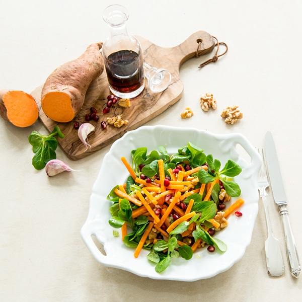Die Blattrosetten des Feldsalats verfügen über kleine Wurzeln, die beim Putzen entfernt werden müssen. Das Dressing immer erst kurz vor dem Servieren auf den Feldsalat geben, da seine sensiblen Blättchen sonst schnell in sich zusammenfallen. Probieren Sie doch einmal unsere feinen Salatkreationen aus der Hagen Grote Küche: Süßkartoffel-Granatapfelsalat und Garnelen auf Avocado-Orangen-Salat.