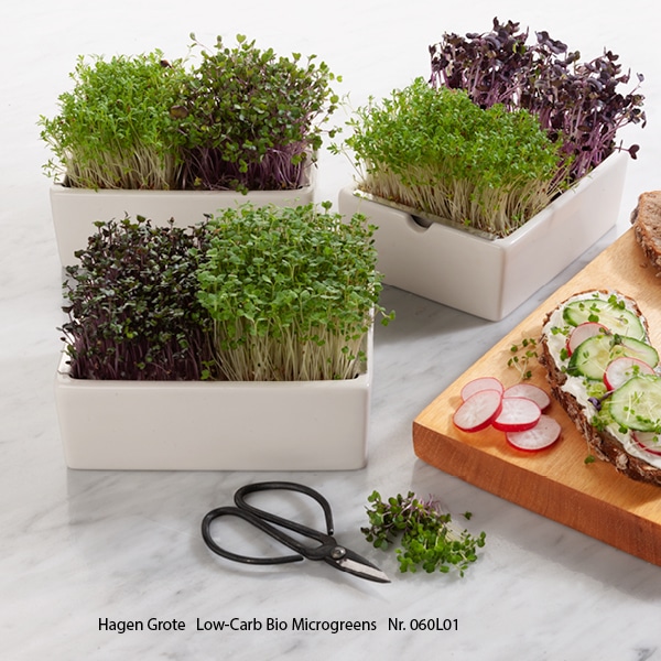 Auch Kresse und Sprossen und Co. wachsen das ganze Jahr über. Äußerst reich an Nährstoffen und Vitaminen sind unsere hocharomatischen Bio Microgreens. Die praktischen Saatpads müssen lediglich in die bis zur Markierung im Wasser gefüllte, mitgelieferte Porzellanschale eingesetzt werden. Kurz darauf lassen sich bereits die ersten Blättchen entdecken. Erntereif ist die köstliche Salatzutat nach 5-7 Tagen.