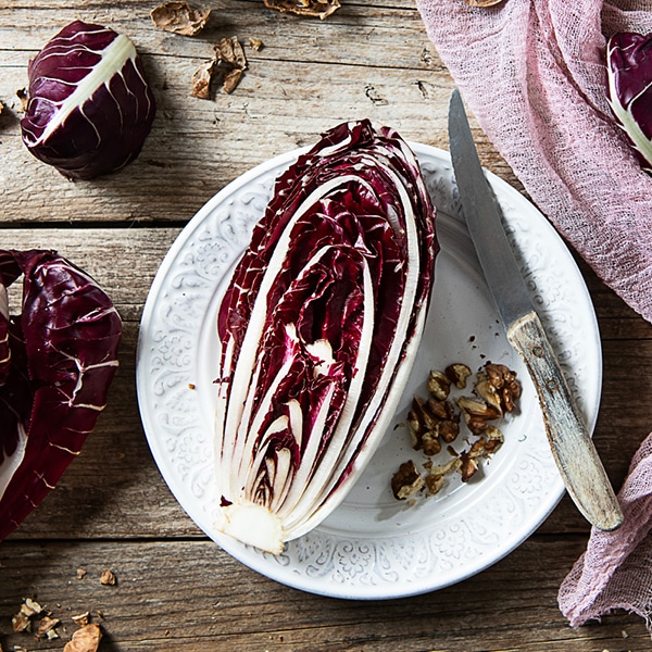 Der rote Radicchio ist mit dem Chicorée verwandt. Beheimatet ist er in Italien, angebaut wird er aber, wie viele andere Salate, auf der ganzen Welt. Aufgrund seines besonders herben, bitteren Geschmacks wird er meist mit anderen Salatsorten kombiniert. Seine kräftige Farbgebung macht ihn zu einem attraktiven Hingucker. Für die Farbe sind Anthocyanen verantwortlich, die vor freien Radikalen schützen. Zusätzlich enthält Radicchio viele Vitamine, wie z. B. Vitamin C, Mineralstoffe wie Calcium, Magnesium und Phosphor sowie den Bitterstoff Intybin.
