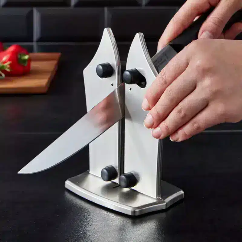 Messerschärfer : Zum Schärfen gibt es neben dem klassischen Wetzstahl auch Wetzsteine. Wer auf Nummer sicher gehen will, setzt moderne Sicherheitsschärfer ein. Damit machen Sie beim Schleifen Ihres teuren Stahl- oder Keramikmesser garantiert nichts falsch und Sie schärfen problemlos selbst Wellenschliffmesser.