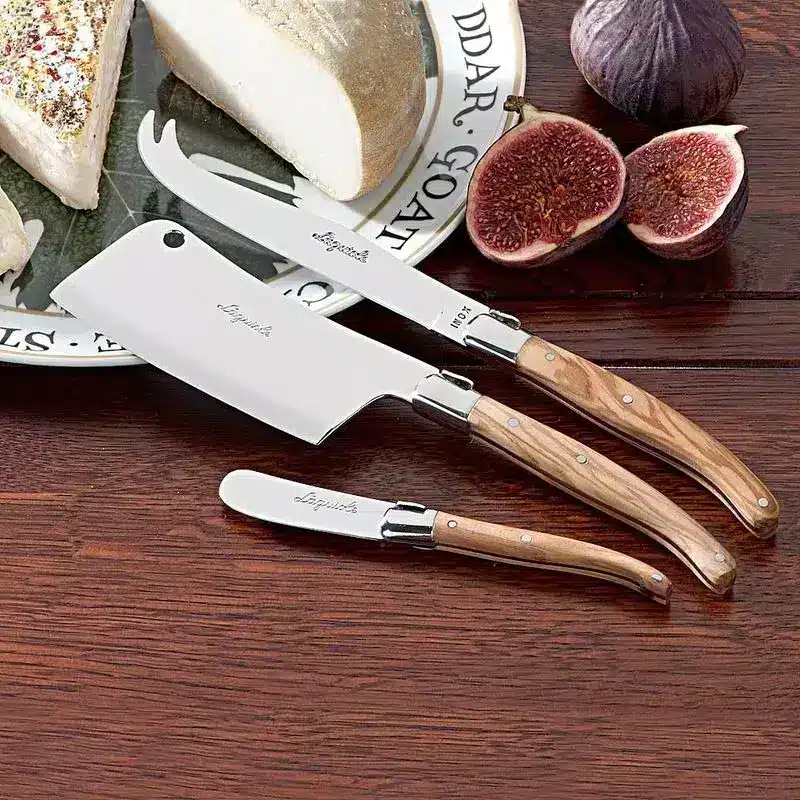 Wertvolles Olivenholz verleiht dem Laguiole Käsemesser-Set besonderen Charakter. Zudem steht die Laguiole-Biene seit nunmehr 175 Jahren für hohe Qualität, an der sich bis heute nichts geändert hat. So haben auch diese Käsemesser den charakteristischen, grazilen Laguiole-Schwung.