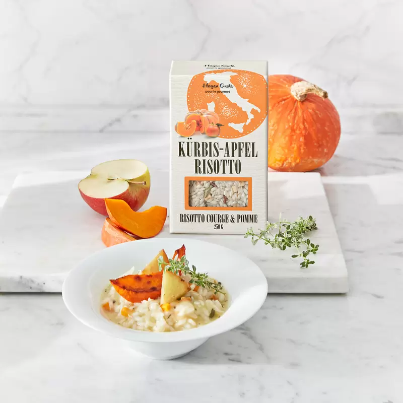 In unserer Delikatessen-Manufaktur veredeln wir Piemonteser Carnaroli-Reis in Premium-Qualität mit erntefrischem Kürbis und Apfel zu diesem köstlichen Risotto.