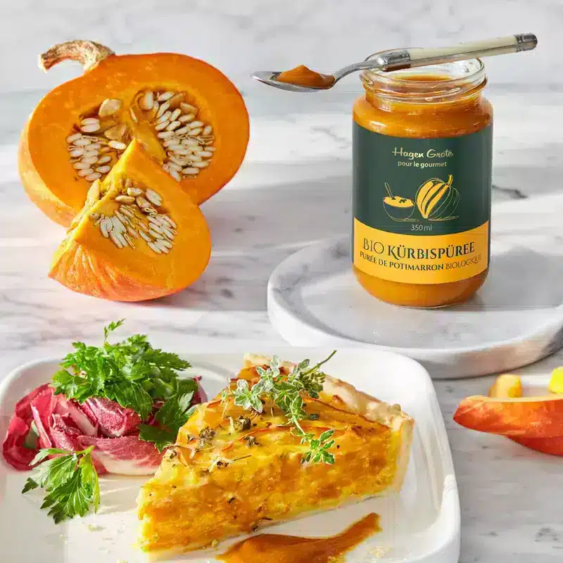 Unser hochwertiges, pures BIO-Kürbispüree verfeinert herzhafte wie süße Speisen, während lästiges Schneiden und Schälen entfallen.