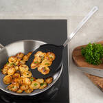 Ganze Pfannkuchen, große Fischstücke oder viele Bratkartoffeln passen zum sicheren Wenden auf Pfannenschaufel und -wender. Die abgeflachte Vorderkante der Schaufel teilt Aufläufe, gleitet schonend unter zartes Gemüse, schaufelt viele Pommes gleichzeitig vom Backblech. Überschüssiges Bratfett läuft durch Schlitze des Pfannenwenders ungehindert ab. Pfannenschonendes Nylon, Edelstahl-Griff, Aufhängeöse, spülmaschinenfest. Pfannenschaufel: Schaufelfläche 16 x 17 cm, Gesamtlänge 37,5 cm, hitzebeständig bis 230 °C. Pfannenwender: Wendefläche 15 x 15 cm, Gesamtlänge 37 cm, hitzebeständig bis 200 °C.