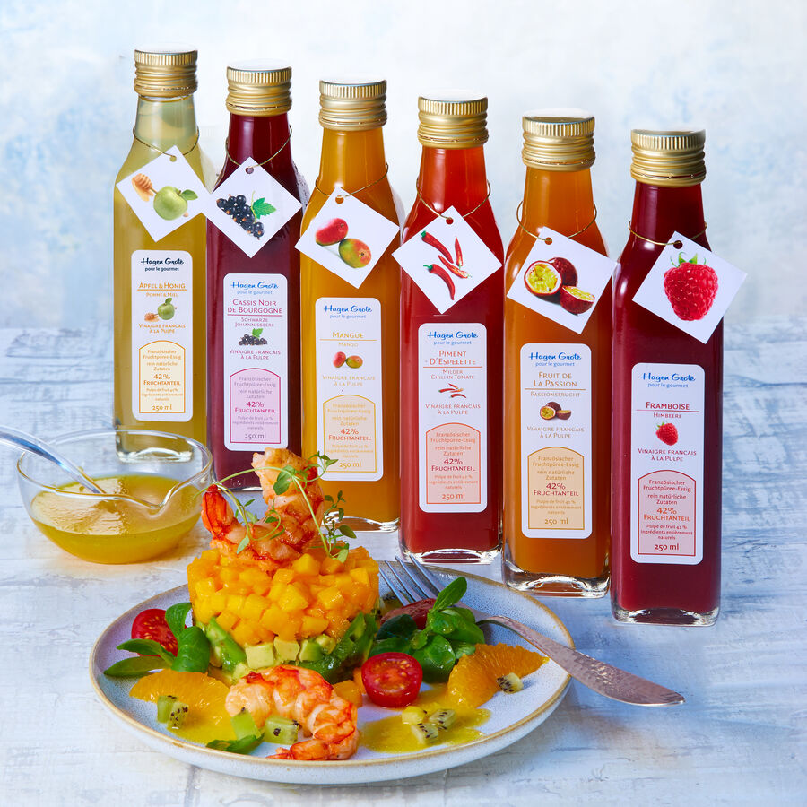 Sämiger, französischer Fruchtpüree-Essig entfaltet außerordentlich delikate Fruchtaromen. Nahezu zur Hälfte (41-42 %) besteht er aus reinem, püriertem Fruchtfleisch. Mit feinem Essig und wenig Zucker entsteht daraus ein raffiniertes Dressing. Spitzenköche verwenden süßsaure Fruchtpüree-Essige pur oder kombiniert mit einem passenden, feinen Öl. Passionsfrucht entfaltet mit Sesamöl einzigartige Aromen. Pikantes Piment d´Espelette in Tomatenpüree geht mit Olivenöl eine temperamentvolle Verbindung von rassiger Säure und Schärfe ein.