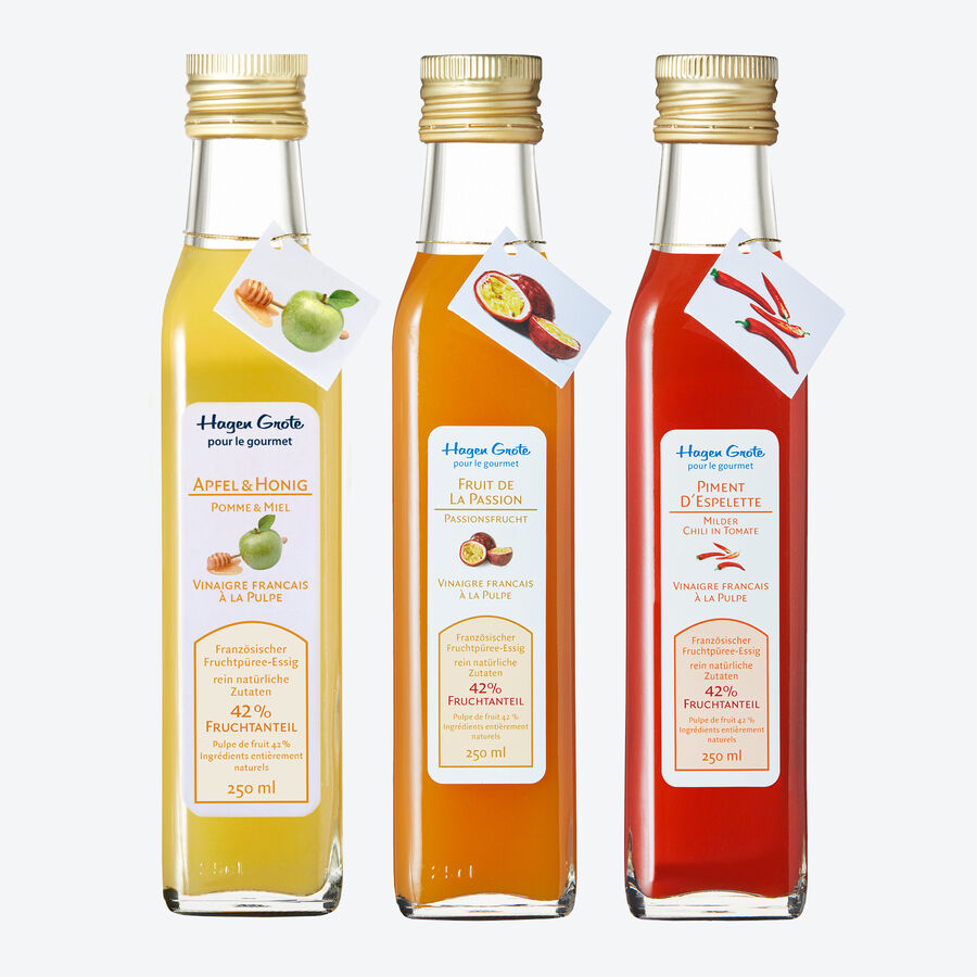 Fruchtpüree-Essig Set, 3 x 250 ml, Passionsfrucht, Piment d´Espelette, Apfel-Honig