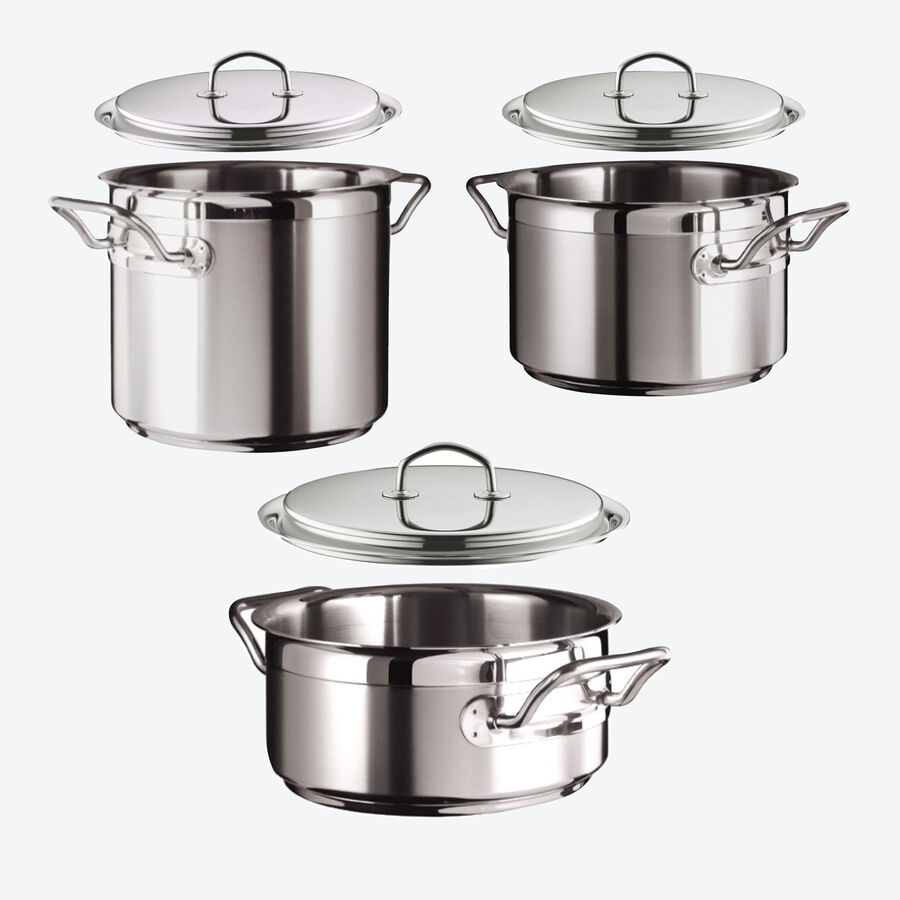 Der 8,8 mm dicke Mehrschicht-Boden mit 6 mm eingekapseltem Aluminiumkern speichert und verteilt die Hitze absolut gleichmäßig und hält sie konstant. Die nahtlos runde Form sorgt für bequemes Umrühren, nichts setzt an. Zuverlässig dicht schließt der Hochraum-Aromadeckel. Optimal für kleine Portionen. 3-tlg. Set: Gemüsetopf, Fleischtopf, Bratentopf. Alle Töpfe Edelstahl, 8,8 mm Mehrschichtboden, 6 mm Aluminiumkern, Schüttrand, Isoliergriffe, ofenfest bis 250 °C, spülmaschinenfest. Für alle Herdarten inklusive Induktion.