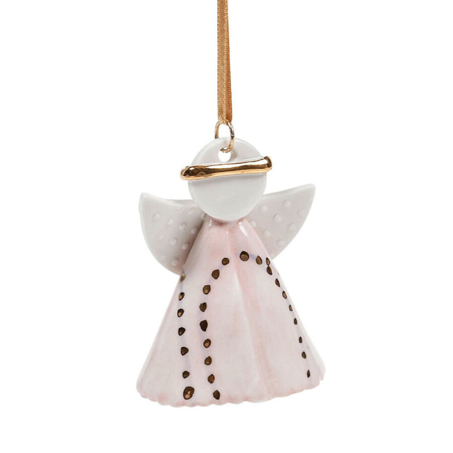 Keramik, Handarbeit, handbemalt und lasiert, ca. 6 cm hoch, Satinbandlänge ca. 25 cm. Jeder Engel kommt einzeln in einer Geschenkverpackung.