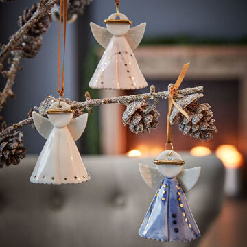 Aus Schweden stammen die drei filigranen Engel Himla, Helene und Hannah. Im zeitlosen skandinavischen Design sind die Engelchen als Weihnachtsschmuck zum Aufhängen eine besondere Zierde. In den Pastellfarben Rosé, Blau und Creme ist jede handbemalte Figur mit liebevollen Details wie einem Muschelsaum oder texturierten Flügeln ausgestattet. Mit dem Satinband können Sie die kleinen Himmelsboten entweder als Christbaumschmuck, an Zweigen oder am Fenster aufhängen. Auch als Glücksbringer eine hübsche Geschenkidee.