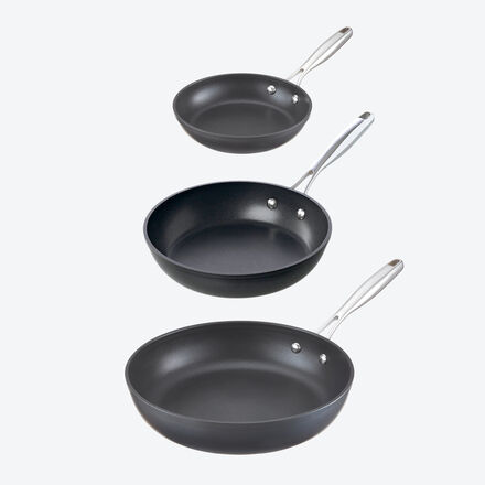 Ein mehrschichtiger Kupfer-Aluminiumkern macht die Pfannen zum professionellen Präzisionswerkzeug. Der superleitfähige Pfannenaufbau gibt Temperaturänderungen ebenso schnell wie präzise an den Pfanneninhalt weiter. Das ermöglicht einzigartig schnelle und exakte Zubereitungen. Über vierfach höhere Beständigkeit verfügt die fortschrittliche, mehrlagige Antihaftbeschichtung. Wesentlich robuster als Edelstahl ist der hart anodisierte Pfannenkorpus. Beim anspruchsvollen Dauereinsatz in der Top-Gastronomie hat sich die Präzisionspfanne mehr als bewährt. Dem ambitionierten Hobbykoch bietet sie modernste Küchentechnik im Top-Design auf professionellem Niveau.