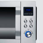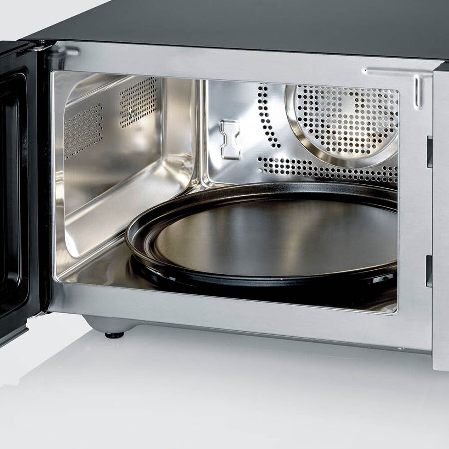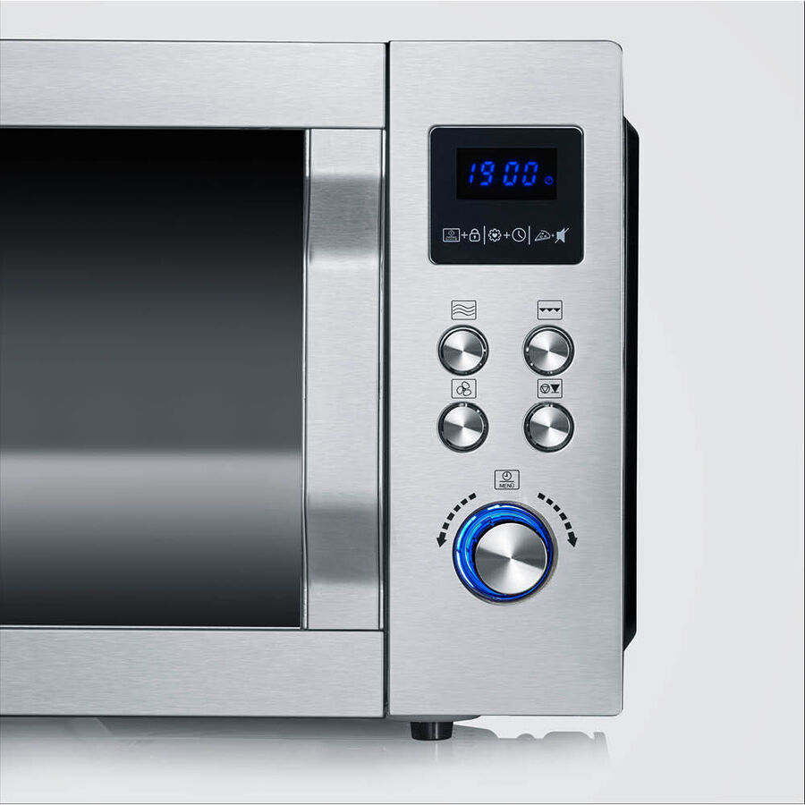 10 Leistungsstufen, Heißluft in 10 °C-Schritten (110-230 °C), LED-Touch-Display. Korpus Edelstahl/Kunststoff 49 x 49 x 29 cm (B/T/H), wiegt 17 kg, Volumen 25 l, antihaftbeschichteter Drehteller Ø 28 cm (Höhe über dem Drehteller 18 cm), hitzebeständige Glastür, Edelstahl-Innenraum 32 x 32 x 20 cm (B/T/H).Mikrowelle 1.400 W, Grill 1.650 W, Heißluft 2.150 W, Abgabeleistung Mikrowelle 900 W, rutschfeste Gummifüße, 1 m Kabel.