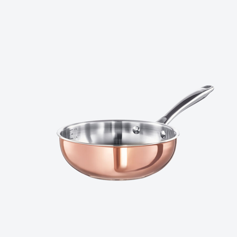Ob Gas-, Elektro- oder Induktionsherd: Kupfer verfügt über die höchste Wärmeleit- und Speicherfähigkeit. Dank der magnetischen Edelstahl-Spezialböden sparen Sie beim Kochvorgang zusätzlich Zeit und Energie. Absolut gleichmäßig erfolgt die Hitzeverteilung. Maßgeblich hierfür sind die beachtliche Gesamtwandstärke von 2,8 mm und der Aufbau in 5 Schichten (innere Edelstahlschicht, darauffolgend Aluminium- und Kupferschichten). Der geschlossene Rand vermeidet Korrosion und garantiert ein ebenso sicheres wie präzises Ausgießen. Die Sauteuse verfügt über eine praktische Skalierung auf der Innenseite. Mit hochwertig genietetem, stets angenehm kühlen Edelstahl-Isoliergriff. Hergestellt für ambitionierte Köche und die Edelgastronomie.